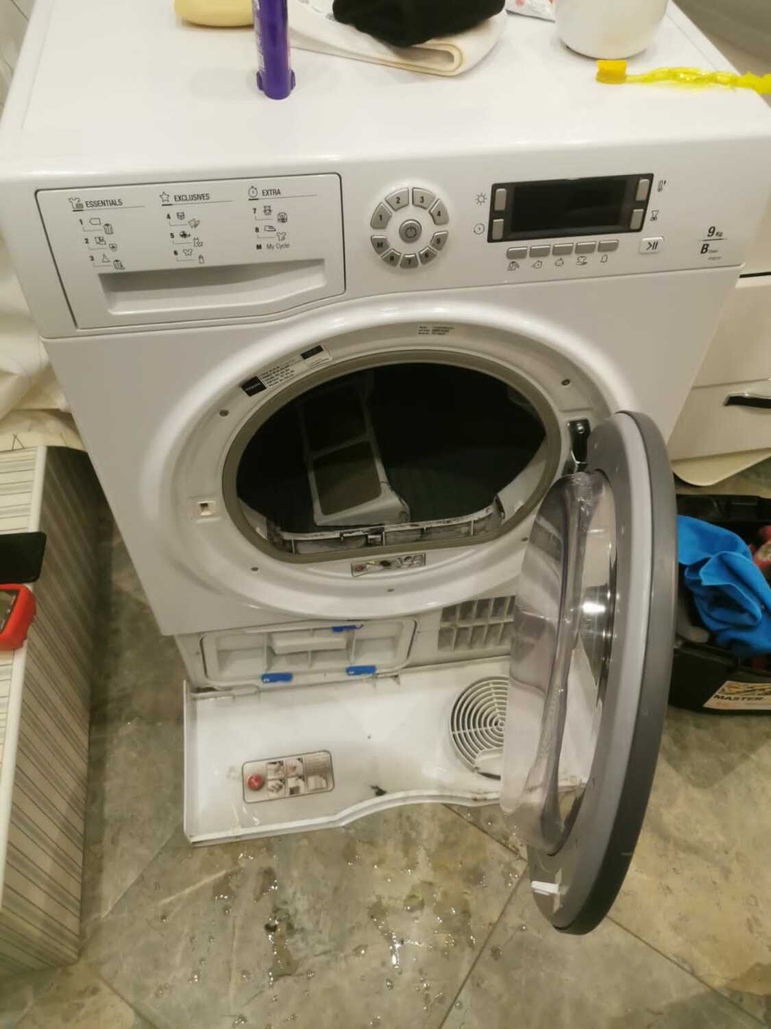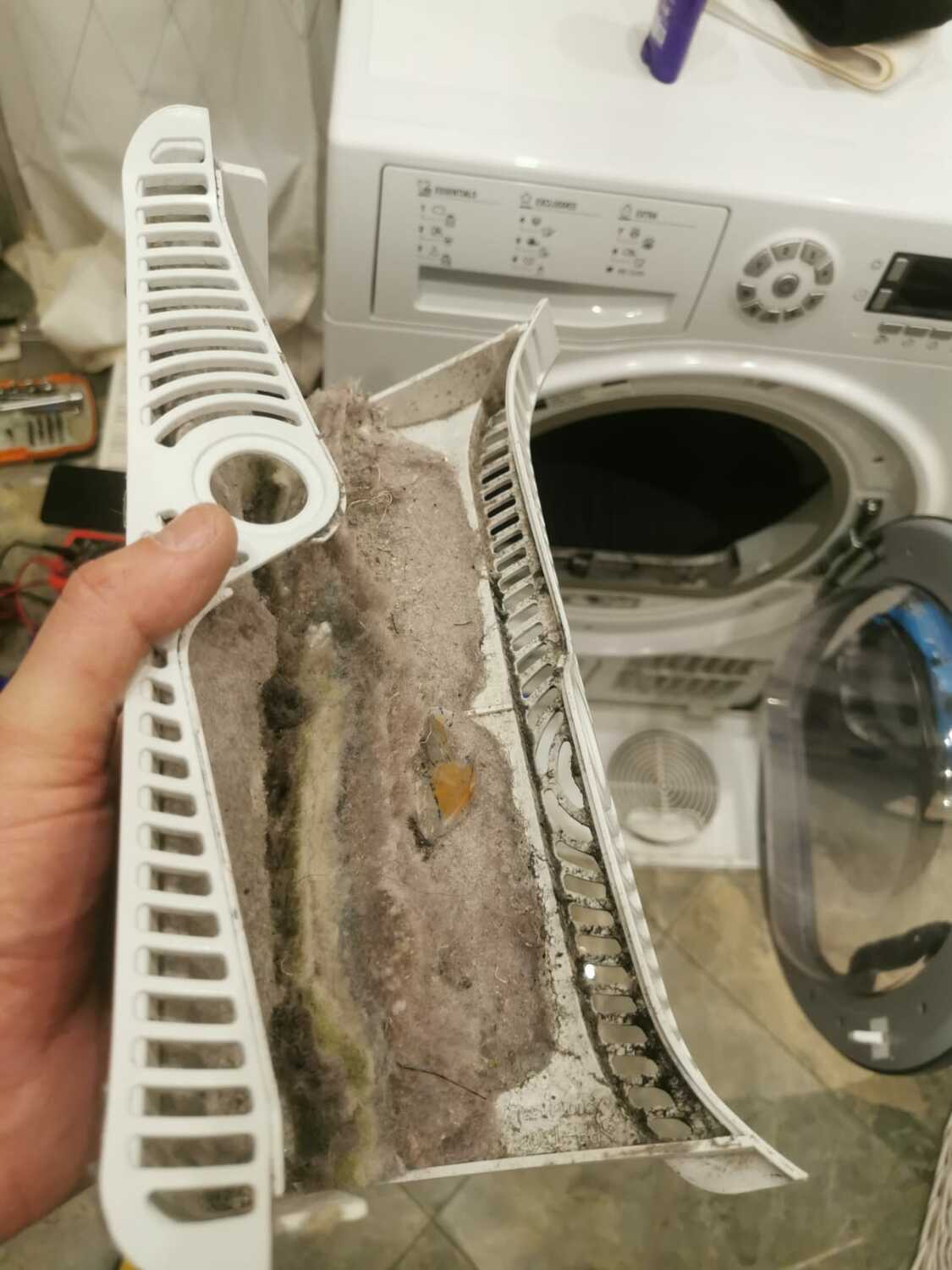 10.07.2022 нашим мастером был сделан ремонт сушильной машины в ЮЗАО г. Москвы. К нам обратилась клиентка с проблемой сушильная машинка плохо сушит. Машинка была продиагностирована полностью (всех узлов и агрегатов). В процессе диагностики было выявлено что засорился фильт.